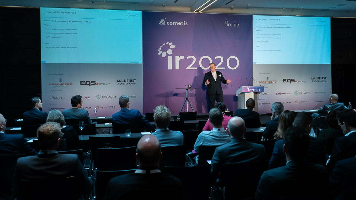 Am 28. Januar war es wieder soweit: cometis und der IR Club veranstalteten die IR Konferenz 2020. Und die war ein voller Erfolg! Mit mehr als 200 Investor Relations Professionals und erstklassigen Referenten bot die Veranstaltung im Sofitel in Frankfurt einmal mehr die Möglichkeit wertvolle Anregungen und Tipps für die tägliche IR-Arbeit zu sammeln. In spannenden Beiträgen zu Vorstandsvergütung, Kapitalmarktrecht, MIFID II, ESG, künstlicher Intelligenz sowie aktiven und passiven Investments machten Fondsmanager, IR-, KI- und ESG-Experten auf künftige Chancen und Herausforderungen innerhalb der Branche aufmerksam und schafften damit die nötige Grundlage für einen weiteren Austausch. Wir bedanken uns für spannende Diskussionen, bereichernde Gespräche und tolles Feedback, das uns auf so vielen Wegen erreicht hat! Wir freuen uns bereits jetzt auf die IR 2021 und wünschen Ihnen ein erfolgreiches 2020!